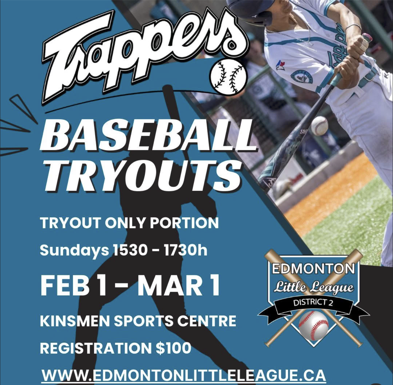 The Edmonton Trappers TRYOUT ONLY portion runs Sundays from 15:30 – 17:30h at Kinsmen Sports Centre (9100 Walterdale Hill, Edmonton, AB T6E 2V3) on Sundays from February 1 – March 1, 2026.